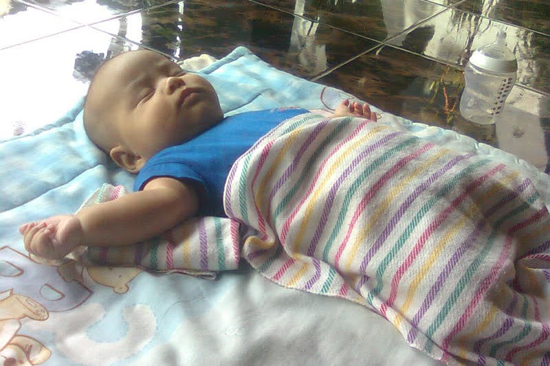 Satu lagi fungsi alas ompol adalah sebagai selimut. Kadang aku tuh suka lupa bawa selimut ketika berpergian dengan bayi. Untungnya ada si alas ompol ini yang ukurannya cukup besar untuk menutupi badan bayi sehingga tidak kedinginan. Oya, alas ompol ini juga suka aku pakai untuk menutupi kaki biar tidak digigit nyamuk dan kadang aku pakai juga untuk menutupi mata bayi saat sedang berjemur.| Mas Deniz (4mo) sedang asyik tiduran pakai selimut alas ompol |